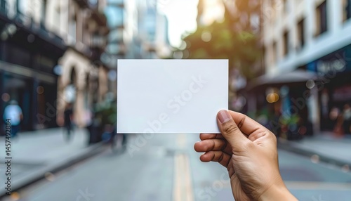 A hand holds a blank white paper against a blurred urban street scene, suggesting a sense of anticipation or a message to be revealed.