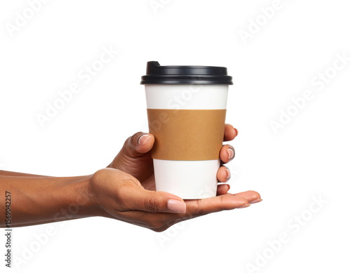 A hand holds a disposable white coffee cup with a brown sleeve and black lid.