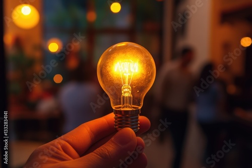 A hand holds a glowing incandescent light bulb, symbolizing ideas and innovation in a warm, dimly lit ambiance.