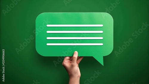 A hand holds a green speech bubble with white lines, symbolizing communication, dialogue, or messaging on a vibrant green background.