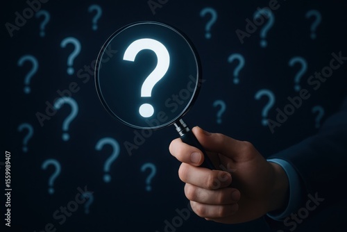 A hand holds a magnifying glass revealing a glowing question mark against a dark background filled with smaller question marks