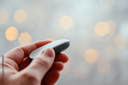 A hand holds a sleek, gray electronic device against a softly blurred background of warm bokeh lights.
