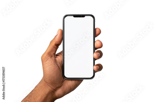 A hand holds a smartphone with a blank white screen.