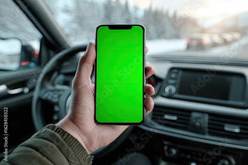 A hand holds a smartphone with a green screen inside a car. Snowy mountain scenery is visible through the window