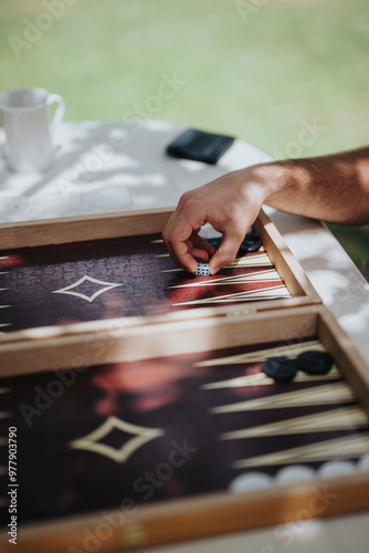 A hand holds dice over a backgammon board, set outdoors. The image captures a strategic and tranquil moment in the game.
