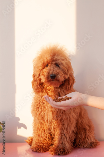 A hand holds out a handful of dry dog food to a miniature red brown poodle
