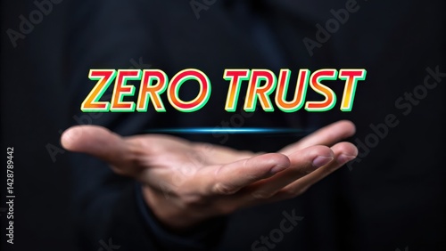 A hand holds the phrase "ZERO TRUST" in vibrant colors, symbolizing a modern security concept focused on verifying every user and device.