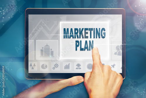 A hand holiding a computer tablet and pressing a Marketing Plan business concept.