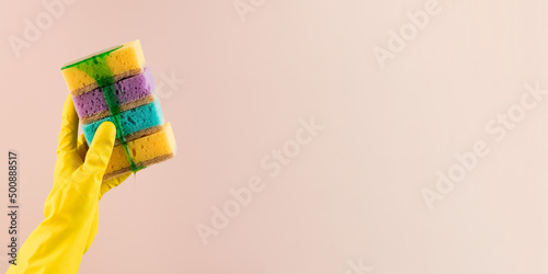 A hand in a yellow rubber glove holds colorful sponges for dishes from which gel. Copy space
