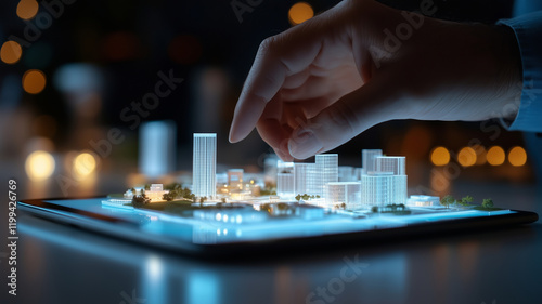 A hand interacting with a futuristic 3D cityscape displayed on a glowing touchscreen.