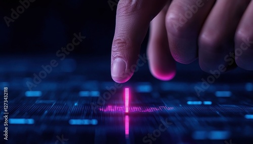 A hand interacting with a luminous digital interface, showcasing advanced technology and innovation.