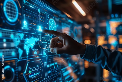 A hand interacts with a futuristic digital interface, displaying data and a world map.