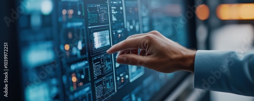 A hand interacts with a futuristic touchscreen displaying data and analytics, emphasizing technology and user engagement.