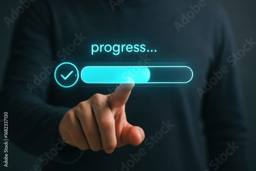 A hand interacts with a glowing, digital progress bar, displaying a sense of technological advancement.