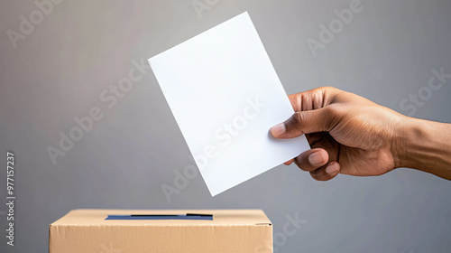 A hand is holding blank voting ballot above ballot box, symbolizing civic engagement and participation in democratic process. This image captures essence of voting and decision making