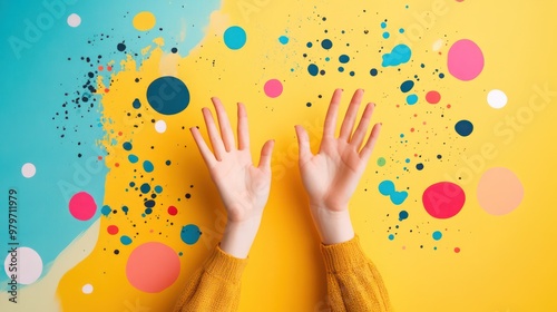 A hand is painted on a yellow background with many different colored dots