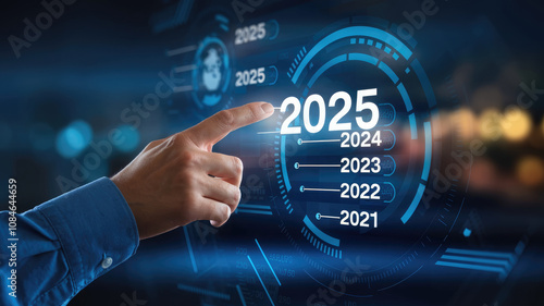 A hand is pointing to the year 2025 on a screen. Concept of progress and advancement, as the year is projected into the future. The blue and white colors of the screen add a sense of modernity