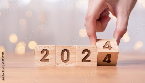 A hand is reaching for a wooden block with the numbers 2024 on it