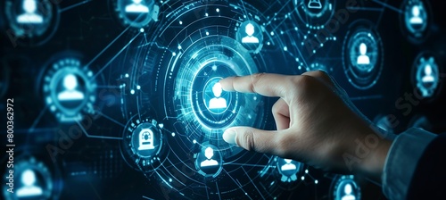 A Hand is Touching User Icon in a HUD Environment. CRM (Customer Relationship Management) Concept Banner