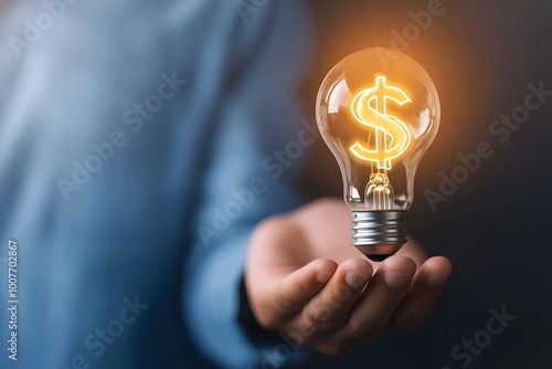 A hand of finance professional holding a lightbulb with a dollar sign filament symbolizing innovative business ideas and financial growth