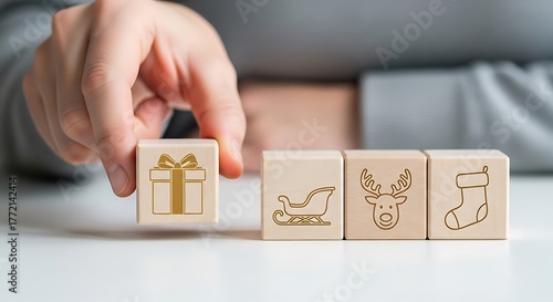 A hand places a wooden block with a golden gift icon next to other Christmas-themed blocks, symbolizing holiday planning or gift-giving.