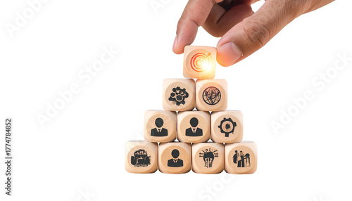 A hand places the top cube on a pyramid of wooden blocks with business-related symbols