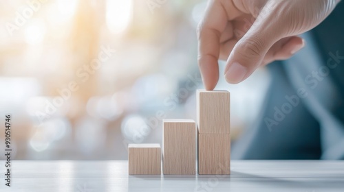 A hand placing a block on a stacked wooden graph, symbolizing growth, progress, and success in business or personal development.
