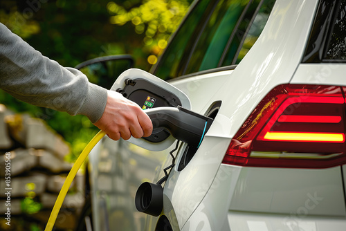 A hand plugs a charger into a white electric vehicle, emphasizing eco-friendly transportation and green energy solutions in a natural setting.