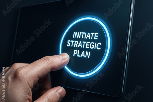 A hand pressing a glowing start button on a sleek glass interface symbolizes making a decisive business decision to initiate a strategic plan fostering innovation and growth