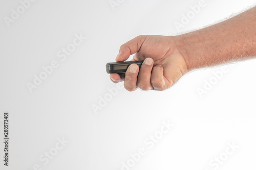 A hand pressing one of the buttons of a car wireless control on a white background. Space to write.
