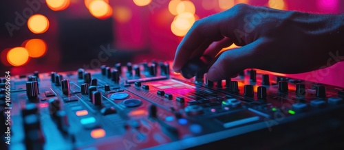 A hand reaches out to adjust a knob on a DJ mixing board. The board is lit with colorful lights.