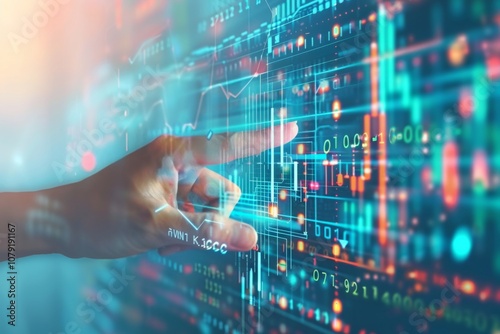A hand reaches out towards a futuristic, digital network composed of lines, graphs, and binary code.