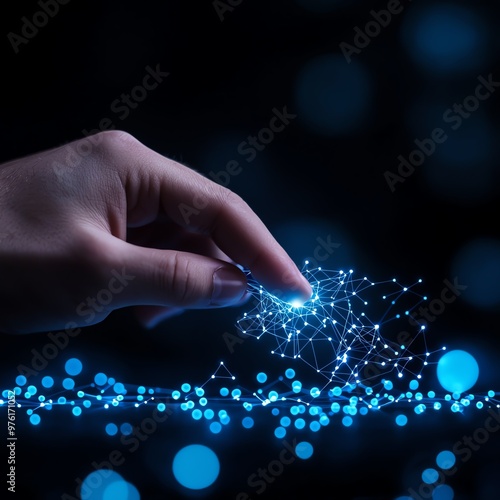 A hand reaching out to touch a glowing network of interconnected nodes, symbolizing technology and innovation.