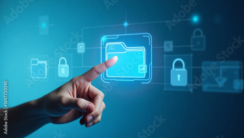 A hand touches a glowing blue digital folder icon, surrounded by connected security symbols (locks, etc.) on a blue background, representing data access/security.