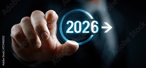 A hand touches a glowing, digital interface displaying "2026" with an arrow, symbolizing the transition to the new year