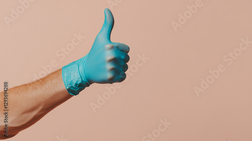 A hand wearing a light blue latex glove shows a thumbs up signal, symbolizing approval or positivity, set against a plain backdrop in a clinical or sanitary environment