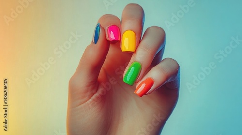 A hand with nails painted in vibrant colors against a light background