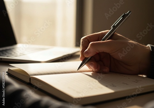 A hand writing in an open notebook, with a laptop partially visible in the background, is illuminated by soft, warm natural light