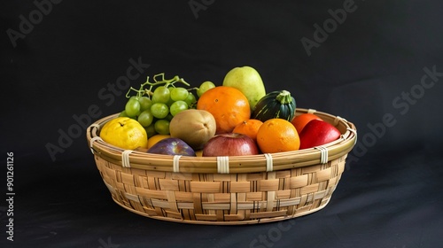 A handcrafted bamboo basket filled with fresh fruits and vegetables