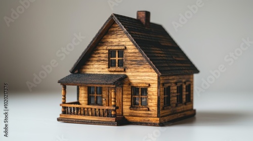 A handcrafted wooden model house showcasing intricate design and rustic charm on a clean tabletop. Generative AI