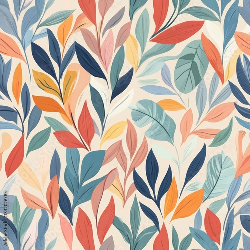 A hand-drawn seamless pattern featuring floral artistic designs, including abstract flowers and modern botanical elements with leaves, textures, and shapes in a colorful creative print