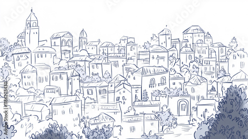 A hand-drawn sketch of a European village featuring detailed rooftops trees and hills with a charming architectural arrangement in soft monochrome tones
