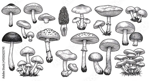 A hand-drawn sketch of various mushroom species arranged aesthetically on a white canvas