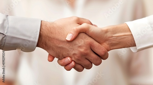 A handshake between a businessman and a businesswoman, sealing a deal.