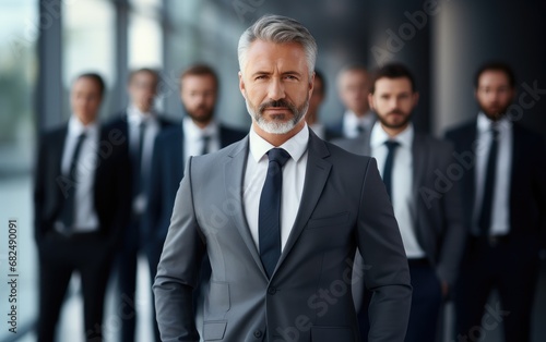 A handsome 50yo senior executive in a power suit confidently leading a diverse team