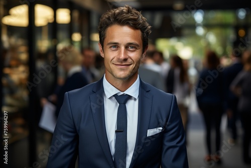 A handsome and confident professional executive in a stylish suit, smiling with assurance in a city setting.