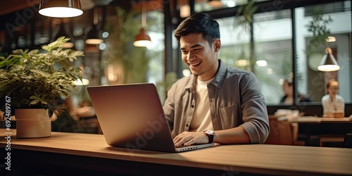 A handsome Asian businessman laughs, working on a laptop in a cozy restaurant setting.