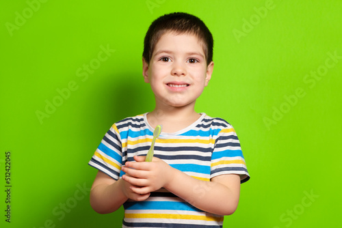 A handsome boy of 4 years old holds a toothbrush on a green screen background, copy space for text