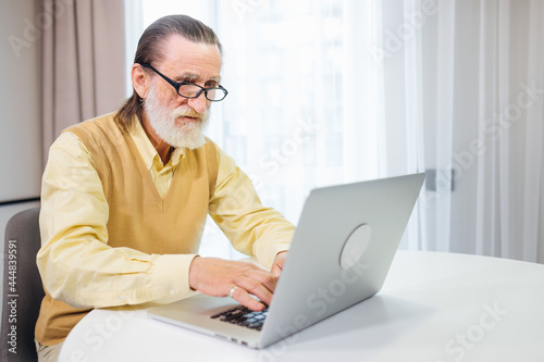 A handsome elderly man concentrates using a laptop sitting at a