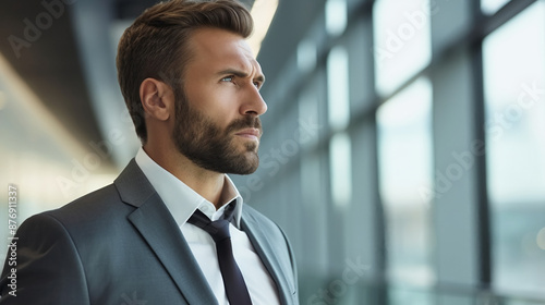 A handsome man in his late thirties wearing business attire, standing inside an airport building with large windows behind him. Business man, Business trip.